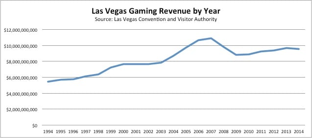 It's because the gambling companies in Las Vegas are now much more diversified with other non-gambling revenue, such as hotel, dining, entertainment, and convention revenue. In fact, the portion of the economy that comes from gambling revenue is at a historic low of just 34%.