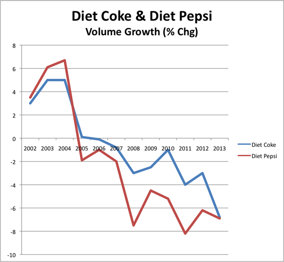 Diet soda in particular remains deeply troubled, with volumes through 2013 in freefall as consumers recoiled in horror at the potential risks posed by artificial sweeteners such as aspartame, high fructose corn syrup, and acesulfame potassium.