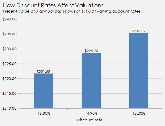 The chart below is an illustration of how the valuation of a series of cash flows changes based on what appear to be relatively small movements in a discount rate. (It is not meant to be representative of CLOs, but an illustration of how a lower discount rate impacts valuation.)