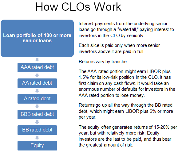Loans are assembled, matched with cheap leverage, then the remaining slice -- the equity -- gets the remainder of the cash flows when all other investors are paid off. Prospect's CLO investments are primarily in CLO equity -- the highest-risk, but highest-return slices of CLOs.