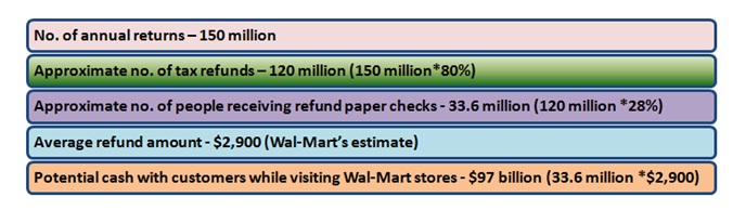 The IRS receives roughly 150 million returns each year, and eight out of every 10 taxpayers receives a tax refund, on average. According to a 2014 study by the Federal Deposit Insurance Corporation, roughly 28% households in America are either "unbanked" or "under-banked." Wal-Mart estimates tax refunds to average around $2,900. Let's do some rough number crunching using these figures: