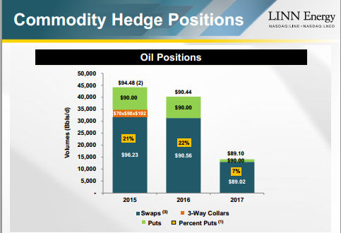 Why is that? Right now Linn has about 75% of its expected 2015 oil production locked in at roughly $94 a barrel. That's well above current oil prices and should allow it to pay its dividend and invest in the business. The company likely has around 50% to 60%, depending on actual production numbers, of next year's production locked in at about $90; there is much less leeway there to pay for the dividend and investments because less oil is protected. And Linn likely has less than 20% of its oil hedged in 2017 at prices in the high $80s, making it unlikely the company could pay the current dividend and sustain a reasonable capital budget that year if oil prices don't recover.