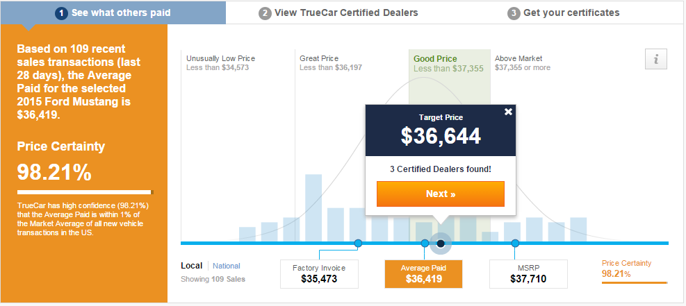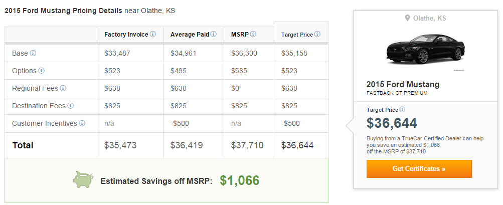 I signed up for TrueCar and decided to research a vehicle I'm very familiar with, and one I'm considering purchasing: a 2015 Mustang GT Premium. Here's what TrueCar showed me, which I found useful.