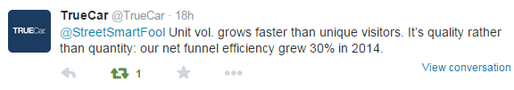 Furthermore, despite a sequential decline in unique visitors and units sold, year-over-year comparisons show strong growth and that TrueCar is becoming more efficient at helping dealerships close sales. TrueCar pointed as much out to me recently, on Twitter.