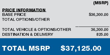 So, here's the problem and my concern. Looking back at the $1,066 that TrueCar estimated I was saving using their services, the majority of that was inflated due to TrueCar's MSRP of $37,710, which was higher than anything I found in the real world. In the fine print, TrueCar explains its MSRP is often higher because other websites don't include destination charges. However, as you can see in the window sticker picture, the real world clearly does -- at least in this example -- include destination charges.