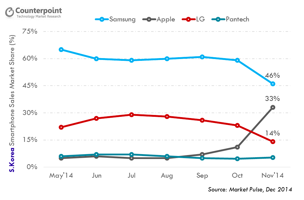 Apple has gained market share in virtually every market in which it operates since its iPhone refresh late last year. However, what's perhaps most telling about the iPhone 6 and 6 Plus' consumer response has been that Apple has made serious inroads in Samsung's home market of South Korea. According to data from Counterpoint Research, Apple saw its share of South Korean smartphone purchases more than double in the first month of the iPhone 6 and 6 Plus' availability, much of it at Samsung's expense.