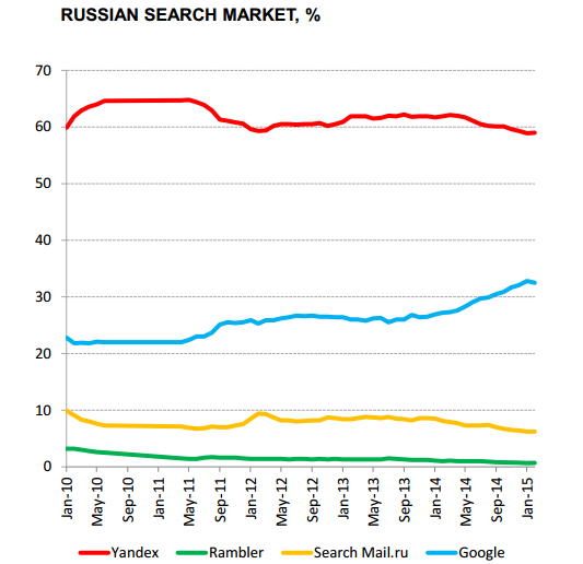 Yandex is the undisputed leader of the Russian Internet search market, with a share of 59.7%, but that was down from 60.3% in the previous quarter, 61.6% in the second quarter, and 61.9% during the same year-ago period. According to Yandex's earnings slides, that share appears to be going directly to Google: