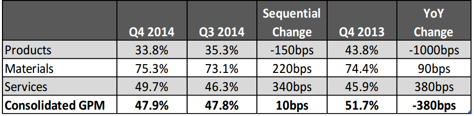 Although 3D Systems previously highlighted that a concentrated number of product launches and manufacturing capacity buildouts have dragged on hardware gross profit margins in 2014, it's an area that investors should continue monitoring because it could also provide insights as to whether 3D Systems may be experiencing pricing pressure headwinds as a result of increasing competition.