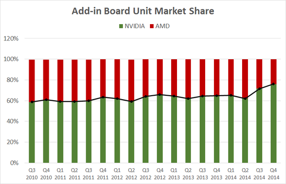 The third quarter of 2014 marked a distinct change in this dynamic. NVIDIA saw a large increase in its market share, up to around 70%, and it appeared as though NVIDIA was starting to pull away from AMD. This could have just been a fluke, of course, but in the fourth quarter of 2014, NVIDIA's market share rose again, this time to 76%. That's about 11 percentage points higher compared to the fourth quarter of 2013.