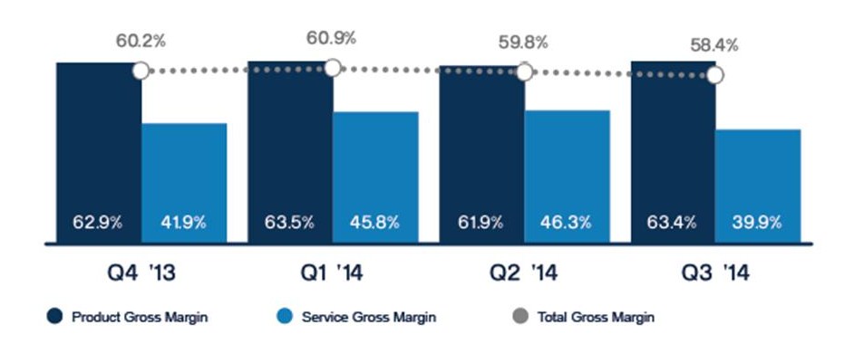 The "product" category includes 3D printers and consumables, or 3D printing materials. While I think it's best to focus on adjusted gross margins, we shouldn't lose sight of the GAAP picture. GAAP quarterly gross margins for Q4 2013 through Q3 2014 are: 50.2%, 51.5%, 51.3%, and 43.1%.