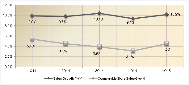 Comparable-store sales for the quarter grew 4.5% -- 2.3% from increased transactions and 2.2% from basket size. The comps growth, though lower than the year-ago 5.4%, nipped the sliding trend seen during the whole of fiscal 2014.