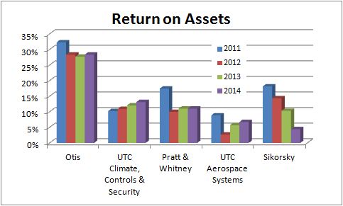 Furthermore, a DuPont analysis comparing United Technologies with Honeywell International shows how United Technologies' asset utilization fell after the acquisition of Goodrich in 2012. Also, Honeywell's aerospace segment ROA is significantly higher than United Technologies.
