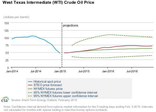 Right now the market is in contango, which means that the market believes that the price of oil will be higher in the future. We see this in the following chart from the U.S. Energy Information Administration, or EIA, which is the government's official energy forecaster.