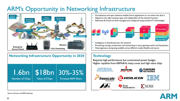 According to an ARM presentation, which is based on both Gartner data and internal analysis, the networking infrastructure opportunity will consist of about 1.6 billion chips worth $18 billion by 2020. ARM is expecting that it will take 30% to 35% of this market by that time, which would be a sizable increase from the 10% share the company currently holds.