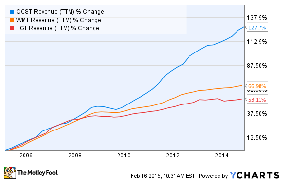 Costco has been growing more briskly than its peers. COST Revenue (TTM) data by YCharts.