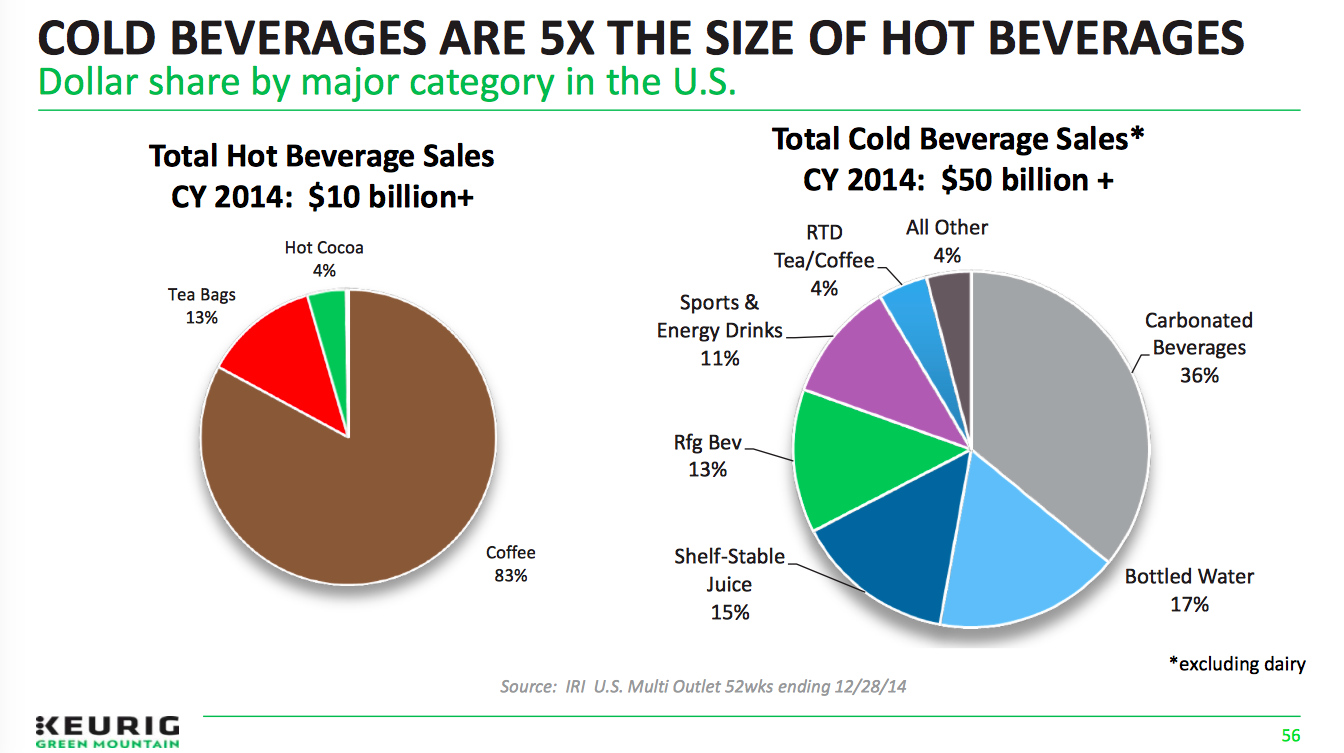 Citing data from market research firm IRI, Keurig's presentation to Wall Street analysts earlier this month noted the addressable cold beverage market is worth some $50 billion in annual sales, or five times the size of hot beverages, which generated around $10 billion in sales last year.