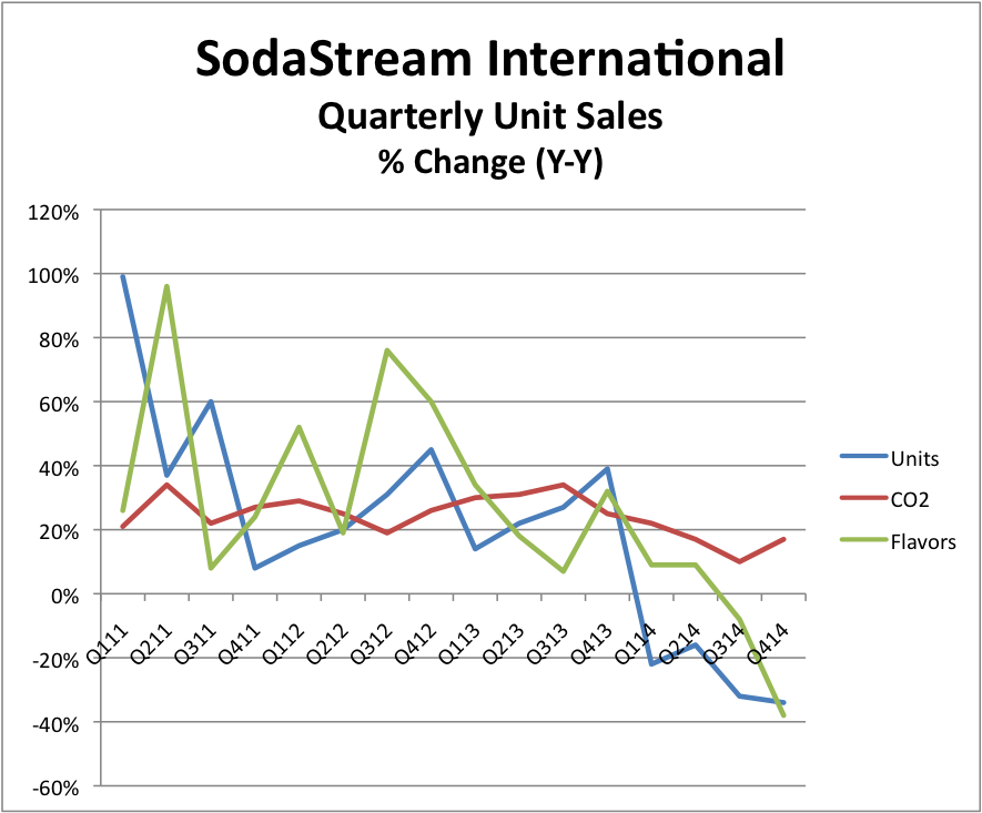 SodaStream sales are in free fall with starter kits plunging 34% last quarter and flavoring sales tumbling 38%. While CO2 units posted a 17% gain year over year, that's only half the 34% rise in sales it enjoyed in the third quarter of 2013, its peak sales period.