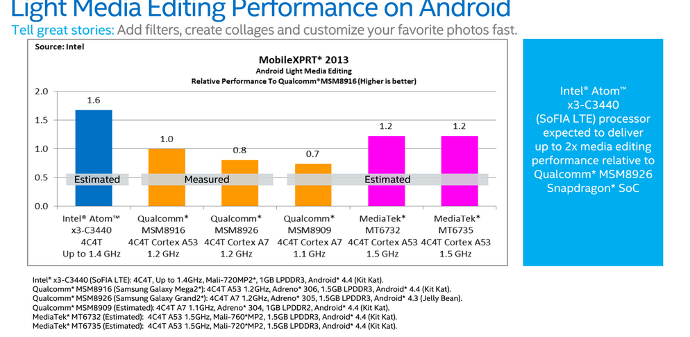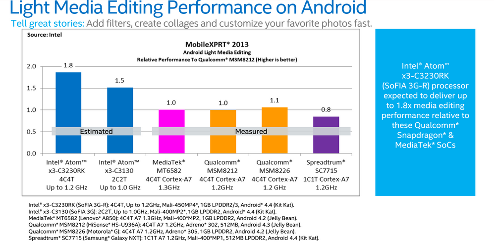 Intel provided the following slide offering a performance comparison of the x3-C3130 and x3-C3230RK against solutions from the competition: