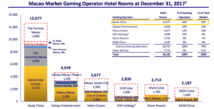 That dominance is about to increase with its coming Parisian resort, which will open toward the end of 2015 and will include over 3,000 guest rooms, making Las Vegas Sands the biggest bet on a growing mass market in Macau, where LVS has more rooms than any other company.