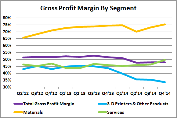 Management previously highlighted that printer gross profit margins would remain constrained while the company worked through a concentrated number of product launches and a manufacturing capacity build-out and expects it will recover in future periods. However, investors should remain cognizant of the company's 3D printer gross profit margin going forward, because it may provide insight into whether the company may be experiencing pricing pressure headwinds as a result of increasing competition.