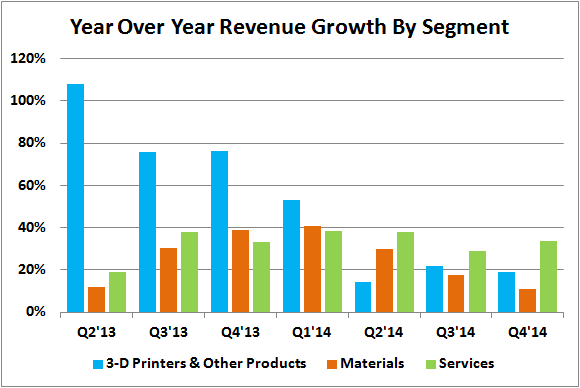 By segment, 3D Systems' 3D printer and materials revenue growth slowed sequentially, while its services revenue growth rate improved, likely because the company completed the acquisition of its Latin American service bureau, Robtec in November.