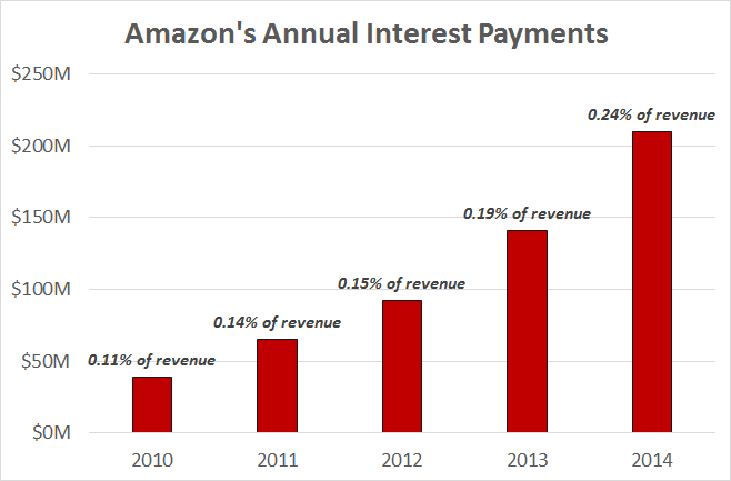 In 2014, Amazon paid $210 million in interest payments. While this is only 0.24% of the company's revenue, it completely erased the meager operating profit Amazon managed for the year.