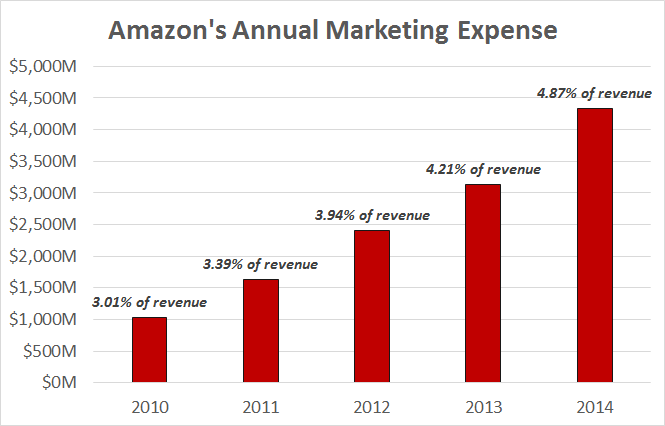 Amazon's starting to near department-store levels of marketing as a percentage of revenue, even though it doesn't have department-store margins. Great retailers don't need to spend heavily on marketing to persuade people to buy things -- Costco doesn't even have a marketing budget, for example. But that's clearly not the case at Amazon.