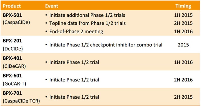 The company plans on pushing five product candidates into numerous early stage clinical trials by mid-2016 for a host of blood disorders, solid tumors, skin cancer, and other afflictions, according to a recent investor presentation. That means Bellicum is unlikely to have a late-stage candidate on tap until at least 2017, pushing a regulatory approval -- under the best-case scenario -- out to 2018.