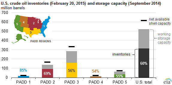 Rising inventory isn't a problem if you can store an infinite amount of oil, but that's obviously not the case. The U.S. Energy Information Administration said in a report this week that inventories had risen from 48% of capacity a year ago to 60% as of the week ended Feb. 20. The chart above shows the capacity problem has only gotten worse in the two weeks since that data was taken.