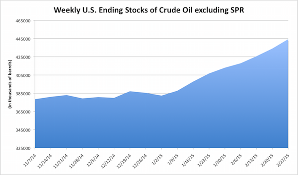 Industry experts have been talking about the oil market being oversupplied by 1 million-2 million barrels per day since last summer. But that oversupply didn't really manifest into increasing U.S. inventories until 2015. That's when inventories started rising sharply, reaching a new record high last week.