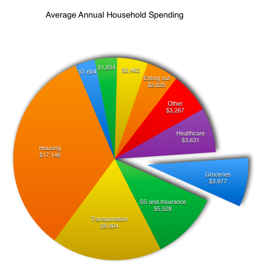 According to the U.S. Bureau of Labor Statistics, the average American family spent $4,000 per year on groceries in 2013, or about $330 each month. That's up 2% from the prior year, and makes food the fourth biggest budget priority behind housing (rent or mortgage), transportation (car payments, gas), and personal insurance and pensions (including Social Security taxes).