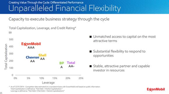 ExxonMobil's biggest advantage over any rival isn't just its size but its access to capital. It's triple-A credit rating is better than the U.S. government, meaning it can borrow as much cheap money as it needs. That's pretty clear after the company recently tried to raise $7 billion in debt only to see demand so strong that it ended up increasing its ask to $8 billion. That cash gives it quite a war chest that it can use to buy out weaker rivals. If it ends up needing even more cash it can easily expand its balance sheet because the company carries very low leverage as we see on the following slide.