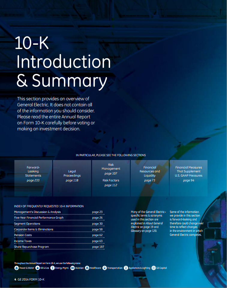 Here's a look at the introduction and summary page that introduces the synopsis of GE's 2014 performance: