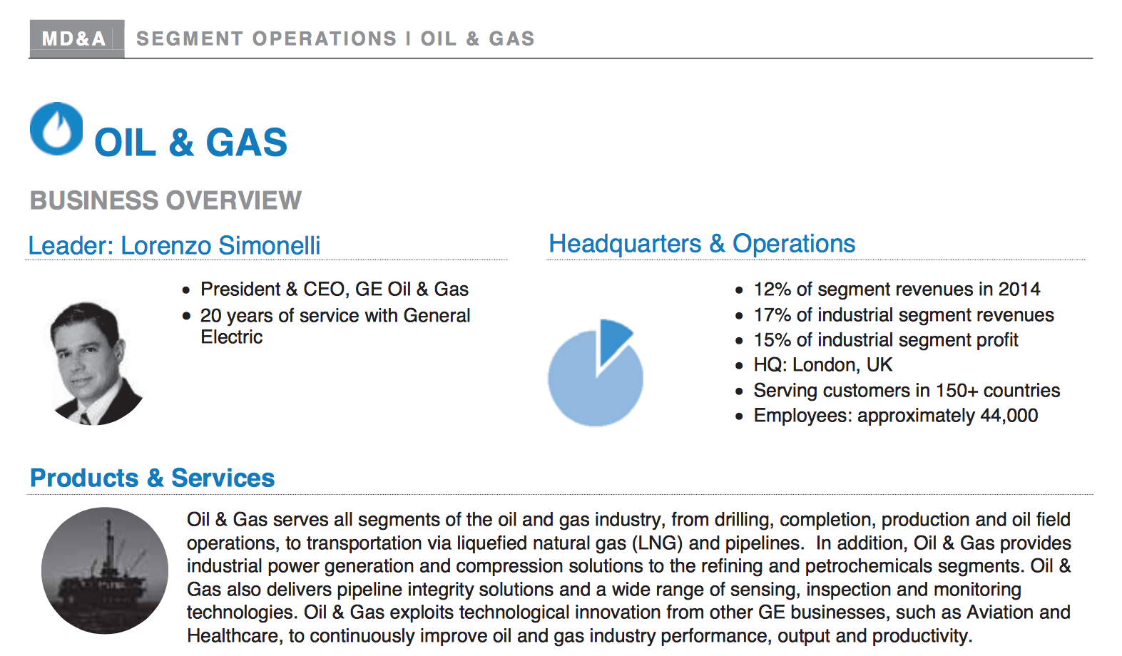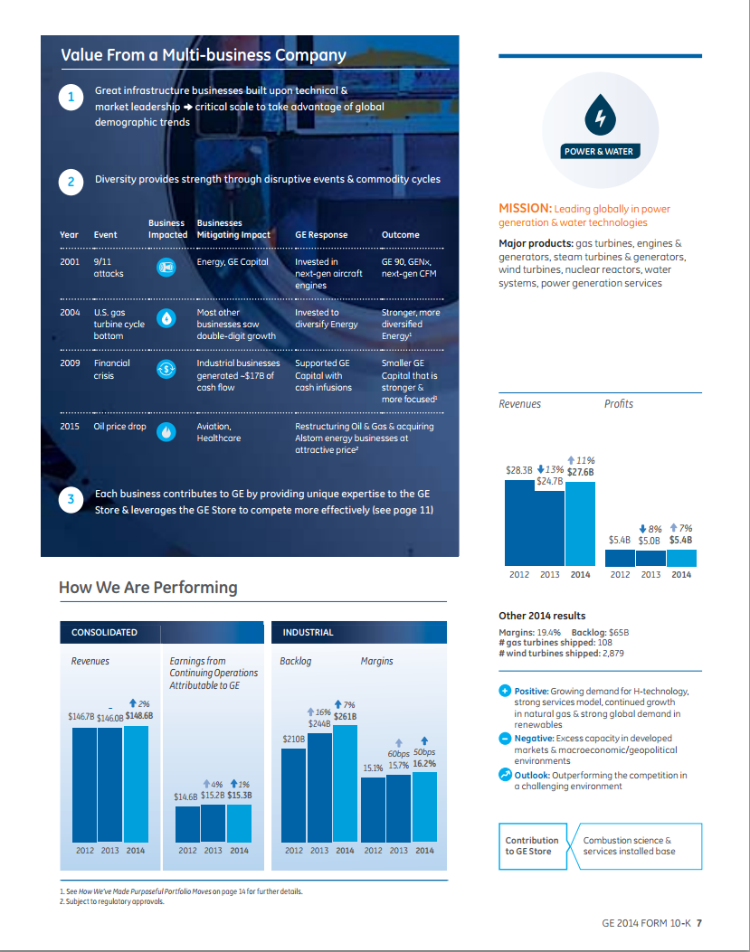GE's management discussion and analysis section gives an overview of each business separately. Source: GE 2014 10-K.