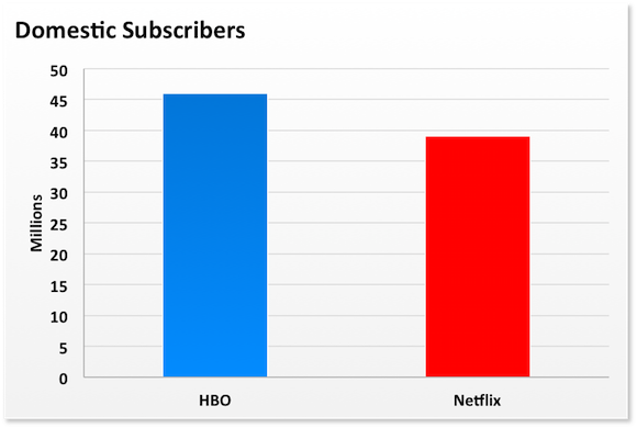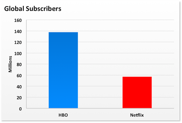 Internationally, HBO remains ahead by a healthy margin. HBO's global subscriber base of 138 million makes short work of Netflix's 57.4 million.