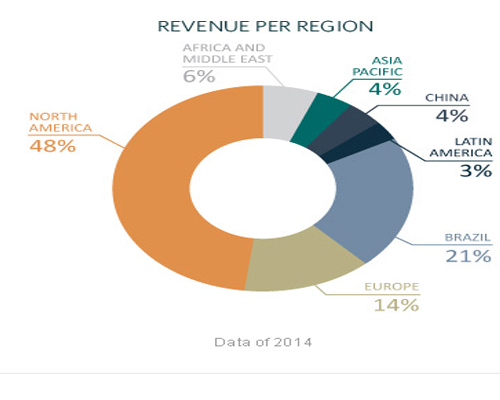 While Embraer is a Brazil-based company, its sales are very much worldwide. The following graph shows how Brazil only comprises about one-fifth of Embraer's revenue.