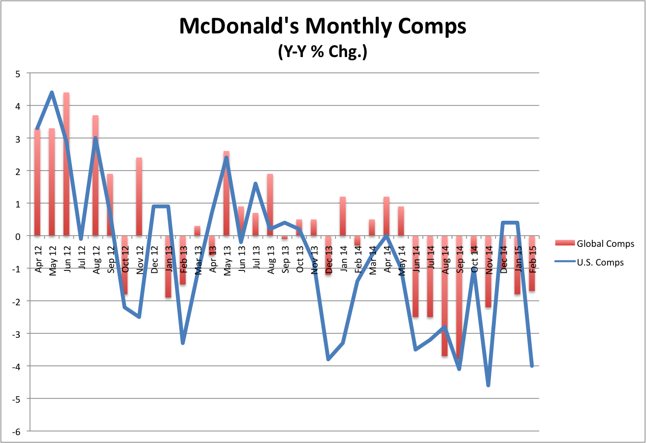 Easy come, easy go. The two consecutive months of rising U.S. same store sales McDonald's (MCD 0.19%) enjoyed in December and January were obliterated in February by comps tumbling 4% from the year ago period, much worse than the 0.7% decline analysts expected.