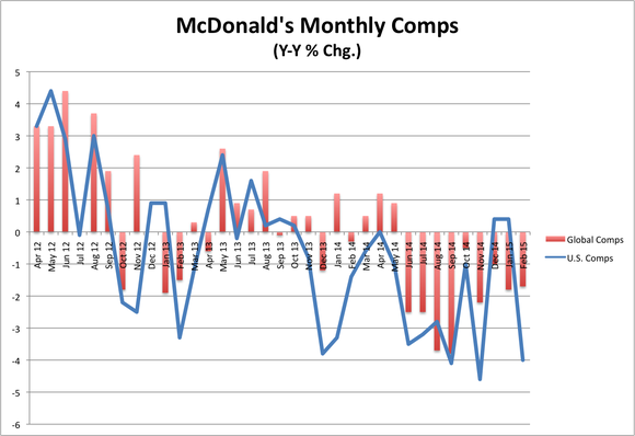 Easy come, easy go. The two consecutive months of rising U.S. same store sales McDonald's (MCD 2.38%) enjoyed in December and January were obliterated in February by comps tumbling 4% from the year ago period, much worse than the 0.7% decline analysts expected.