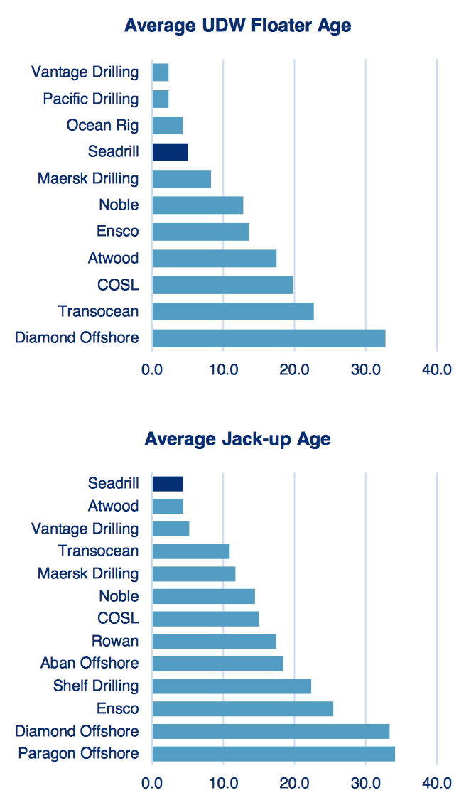 In the fourth quarter, Ensco wrote down $3.9 billion in assets, meaning they had more value on the balance sheet than what offshore rigs were actually worth. This is what happens when you have aging rigs that are less competitive than new rigs in the current oversupplied offshore drilling market. You can see on the left that Ensco has a middle-of-the-pack floater fleet when it comes to age and one of the older jack-up fleets.