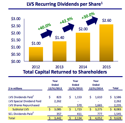 Importantly, Las Vegas Sands has delivered consistent dividend growth during the last several years and planned a 30% dividend hike for 2015. In addition, the company has used share buyback programs to deliver shareholder value. In fact, during the three-year period ended on December 31, 2014, Las Vegas Sands had returned more than $9.6 billion to shareholders when including both dividends and buybacks. Recently, the company has announced a new $2 billion share-buyback program signaling promising growth ahead.