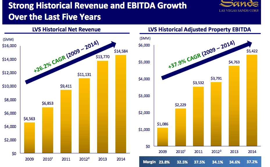 Digging deeper, Las Vegas Sands has consistently delivered strong sales and profit growth over the years, even while facing challenging conditions in 2014. The company produced an adjusted EBITDA margin above 37% last year, which suggests the rock-solid cash flows will allow the company to successfully sail through the storm.