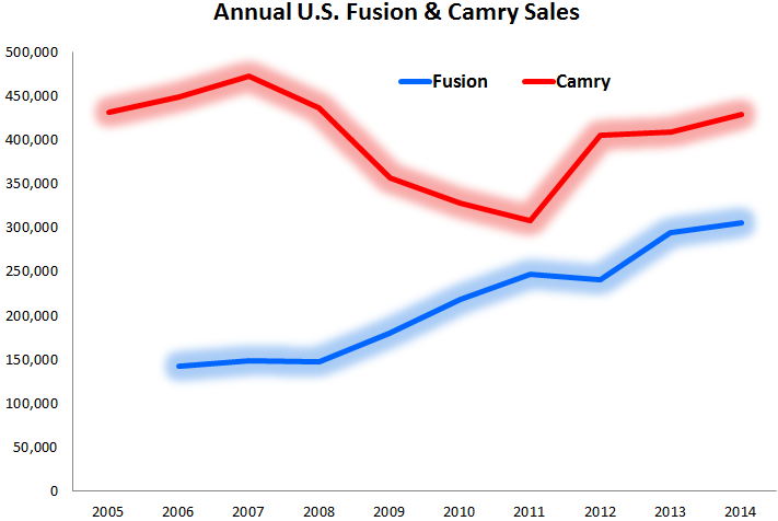 Fast-forward to today. Is it possible the Fusion can finally top the Camry in coming years to end the latter's more-than-a-decade stint on top in terms of midsize segment sales?