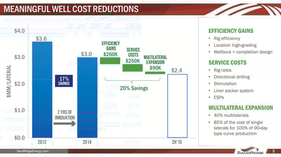 However, what oil companies are finding is that the price of oil isn't the only thing falling these days; well costs are also dropping, too. That's enabling companies like SandRidge to see a future where it can earn the same returns at $50 oil that it had been enjoying when crude was $80 a barrel.