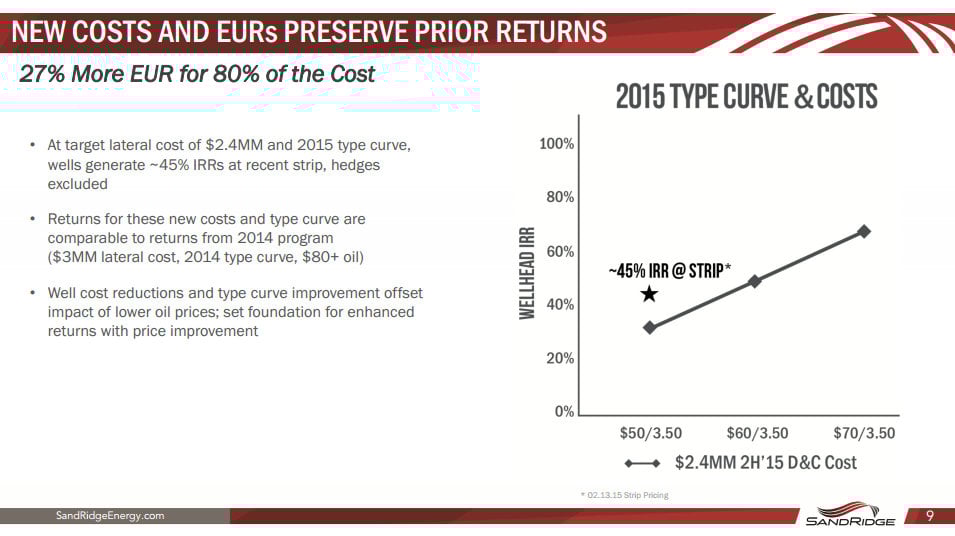 However, what's compelling about this is that return could actually end up being even higher given the current outlook for oil prices in the market, which are signaling a $60 oil price by the end of the year. What that suggests is that based on this strip price, if SandRidge Energy could drill a well for $2.4 million, then its internal rate of return would actually be 45%. That just happens to be the return the company was enjoying at a $3 million well cost, and an $80 oil price not that long ago.