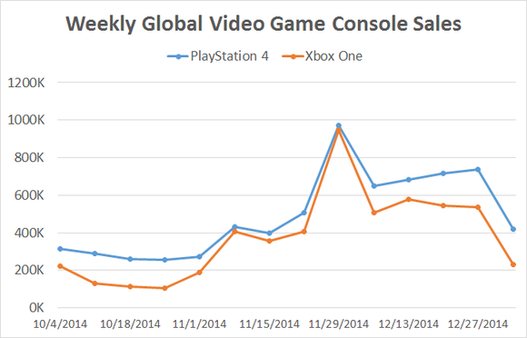 The PlayStation 4 grabbed an early global sales lead over the Xbox One and never looked back. While the chart below only shows worldwide fourth-quarter 2014 sales data, hopefully it's clear Sony's device has been the consistent sales leader.