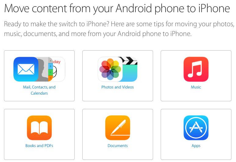 Screenshot from Apple's Web page dedicated to helping new iPhone customers switching from Android learn how to move their content to iOS. Image source: Apple.