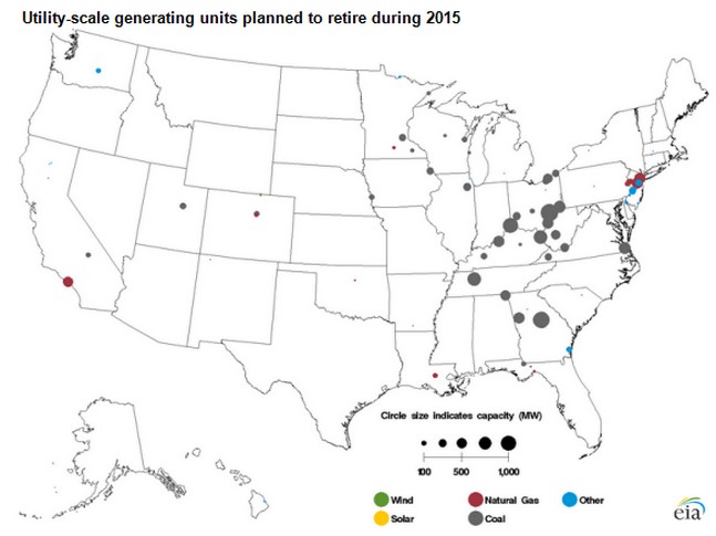 The United States is increasing its total electricity supply for 2015, but not by much. As we load up on wind and natural gas, we're cutting coal like never before. Nearly 13,000 MW are slotted for retirement in 2015, primarily because of new environmental air quality regulations.