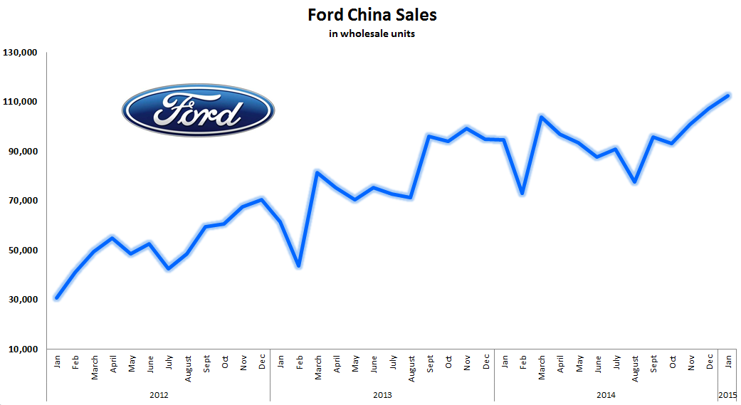 Adding in Ford's China sales in February, which is historically the weakest month of the year for the company, brings its two-month sales total to nearly 192,000. That's a healthy 15% increase over last year, and it signals that Ford's growth in China is set to continue in the double digits for 2015.