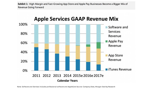 But with the help of Apple Pay, fast-growing App Store revenue, and a new TV service, Huberty believes Apple's services segment could account for 20% of total earnings within the next few years. To illustrate exactly where she expects the growth to come from, Huberty shared this chart of her predictions of Apple's services generally accepted accounting principles revenue mix through 2017.
