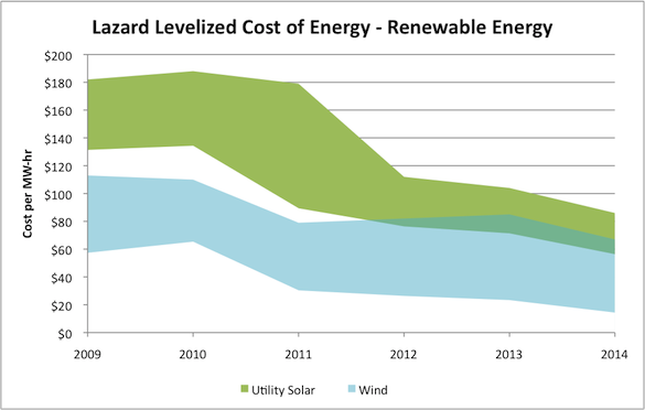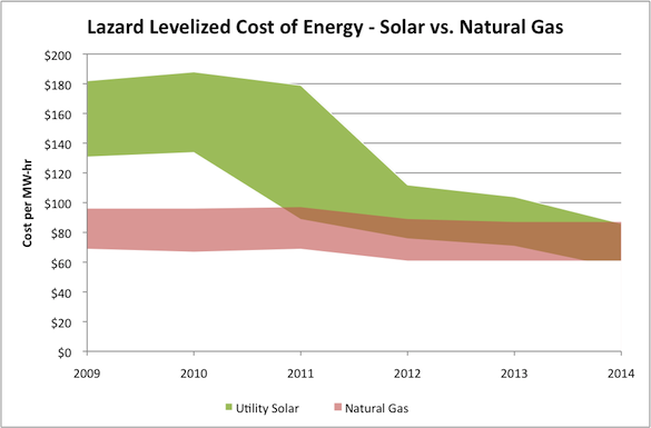 According to Lazard's annual analysis of the levelized cost of energy, it now costs about the same on a per kW-hr basis to build a utility-scale power plant as it does to build a natural gas plant. You can see below that the cost of solar energy has dropped dramatically in recent years while natural gas costs have remained flat.